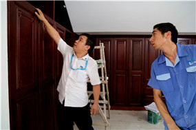 左右手負(fù)責(zé)人在衣柜安裝現(xiàn)場進(jìn)行指導(dǎo)